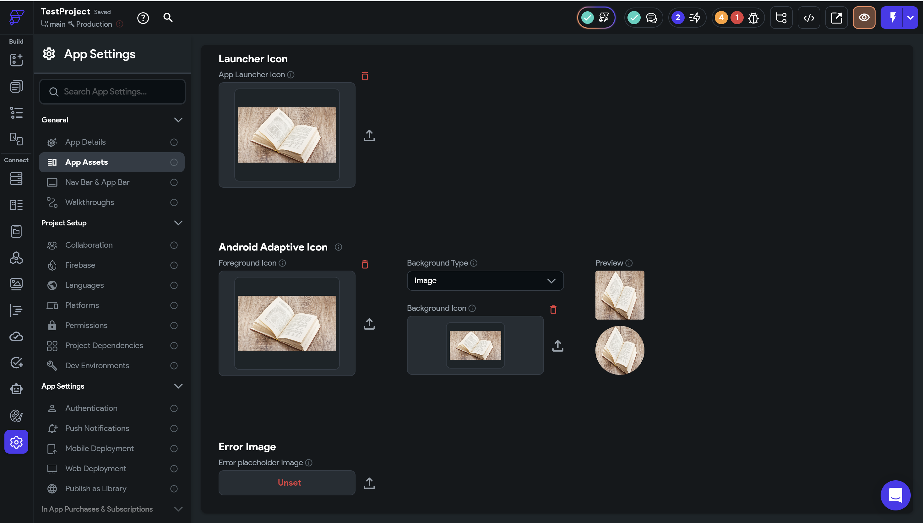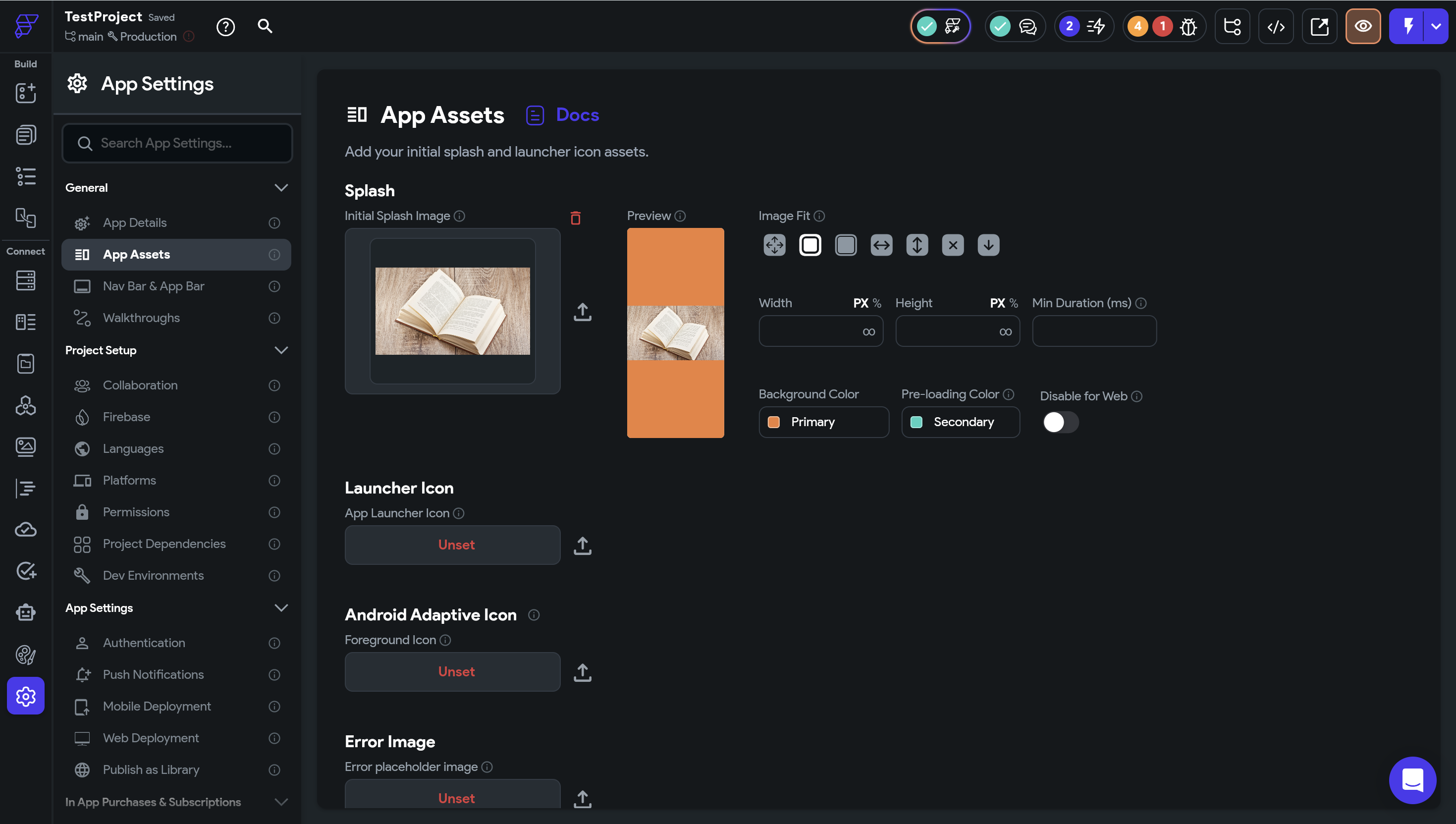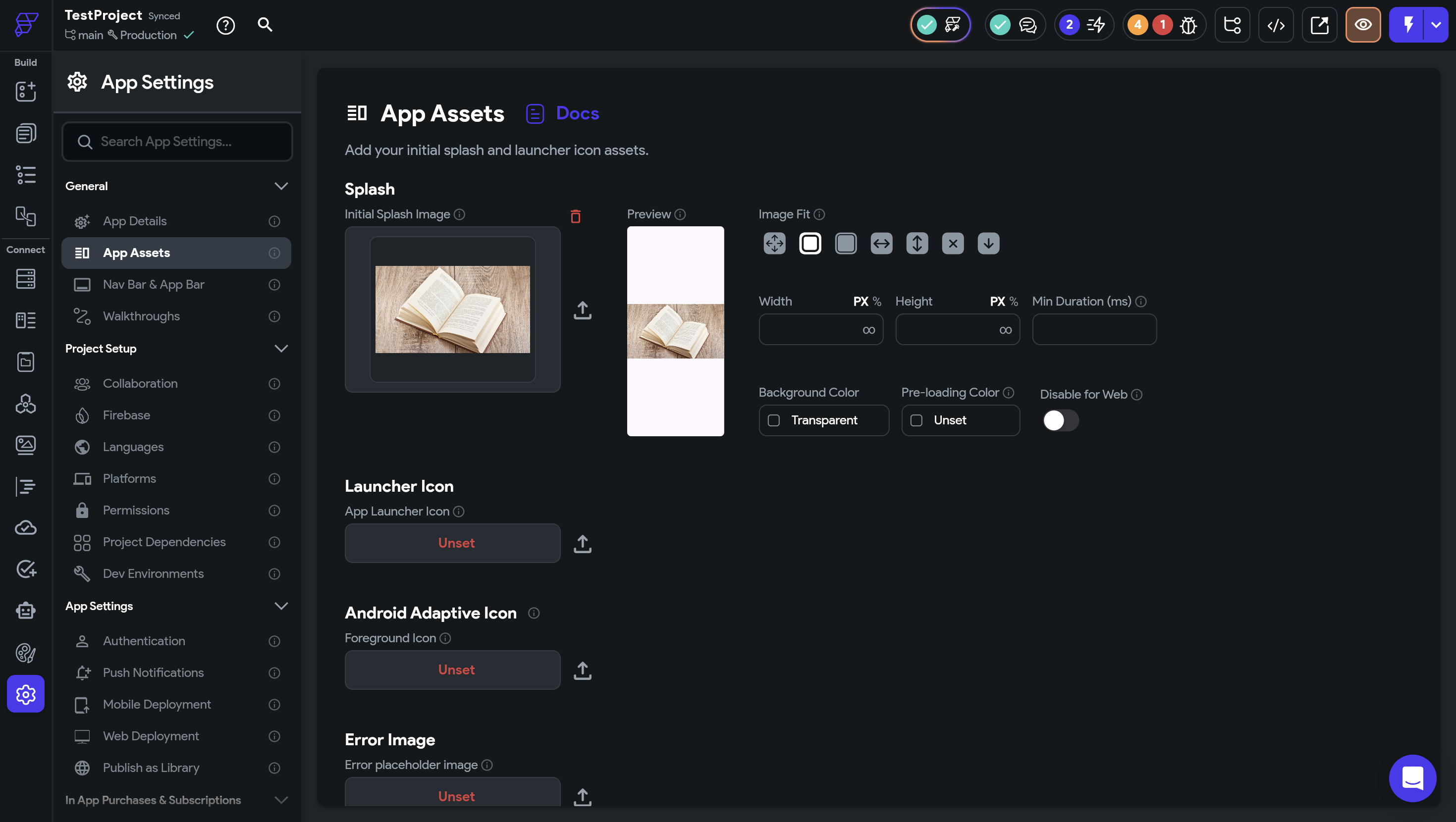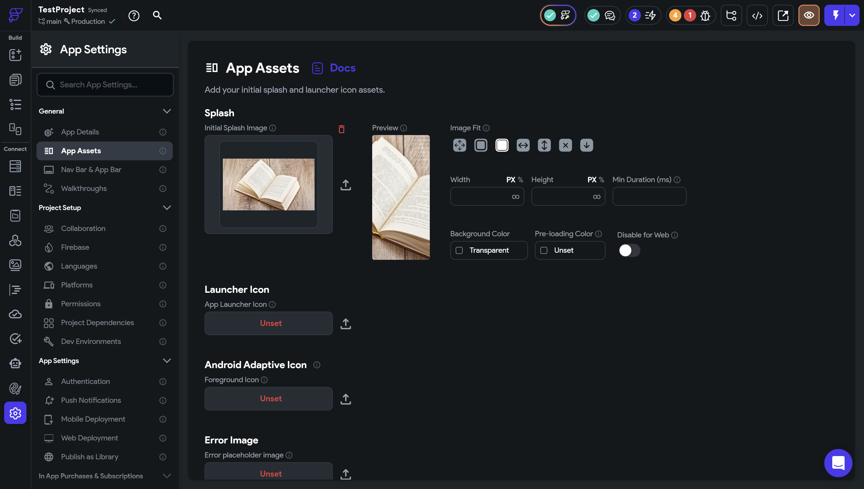 Splash, Launcher Icon, Android Adaptive Icon, Error Iconの4種類を設定することができます